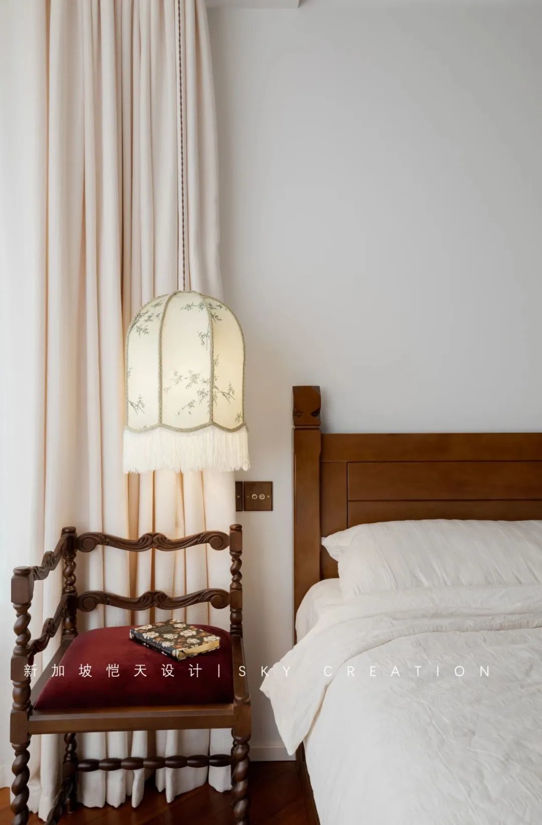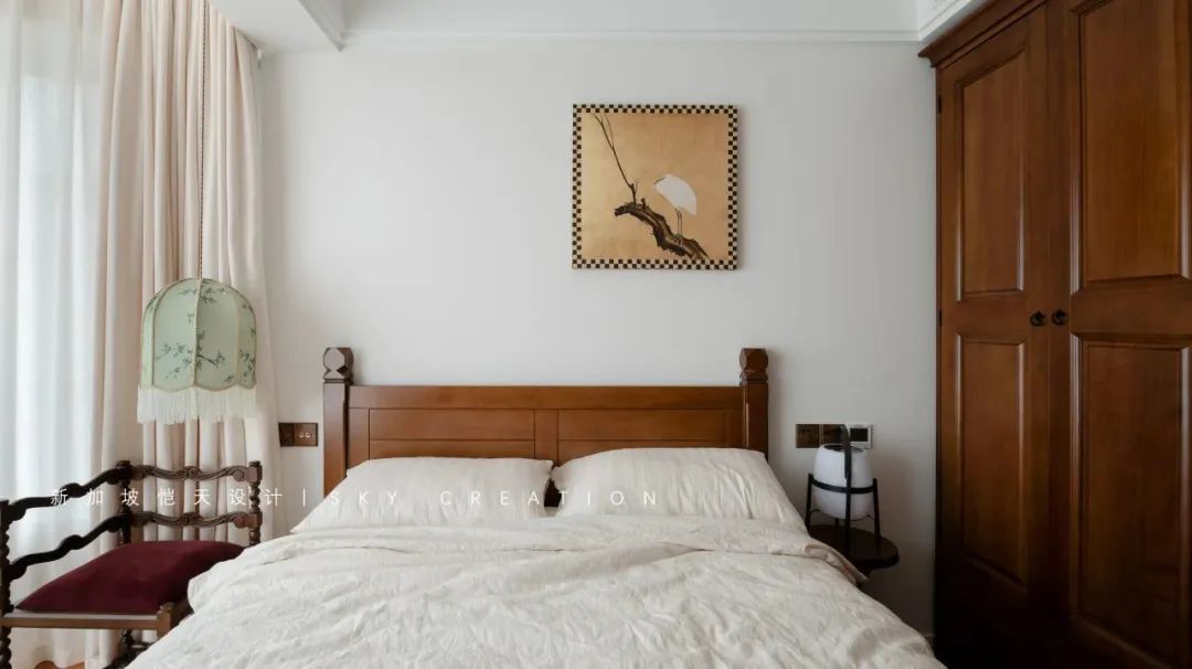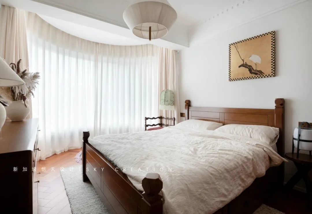 自带温柔滤镜的暮云纱帘和室内的中古调相应,营造出静谧舒适又清雅的睡眠空间。