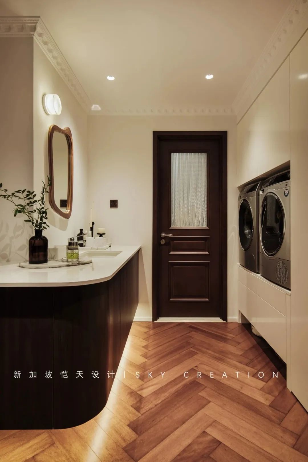 4. 玄关柜与洗手台做一体式拐角弧形柜,满足收纳需求,视觉整体、美观。