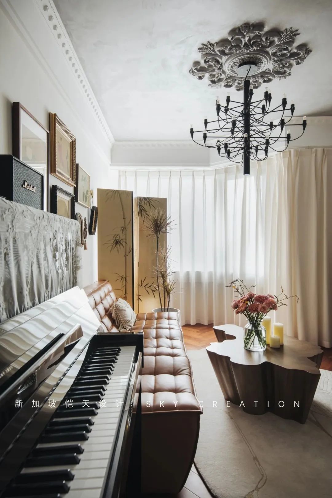客厅空间虽小,却极富腔调:法式壁炉、精致雕花、艺术漆墙顶、中式金箔竹子屏风……古与今、中与外,搭配的相得益彰,扑面而来的艺术氛围感,让人无法抗拒。