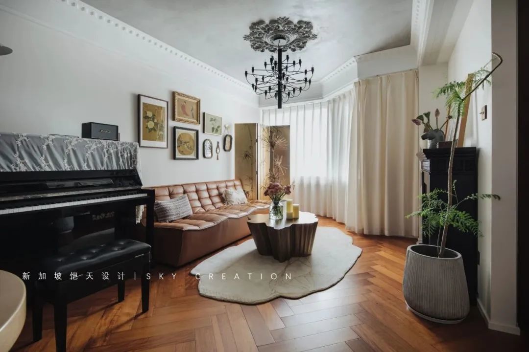 大面积复古色调,巧用轻盈梦幻的米白纱帘调和,提升空间的的明亮度,深浅相宜,做到色调形态与材质之间的平衡。