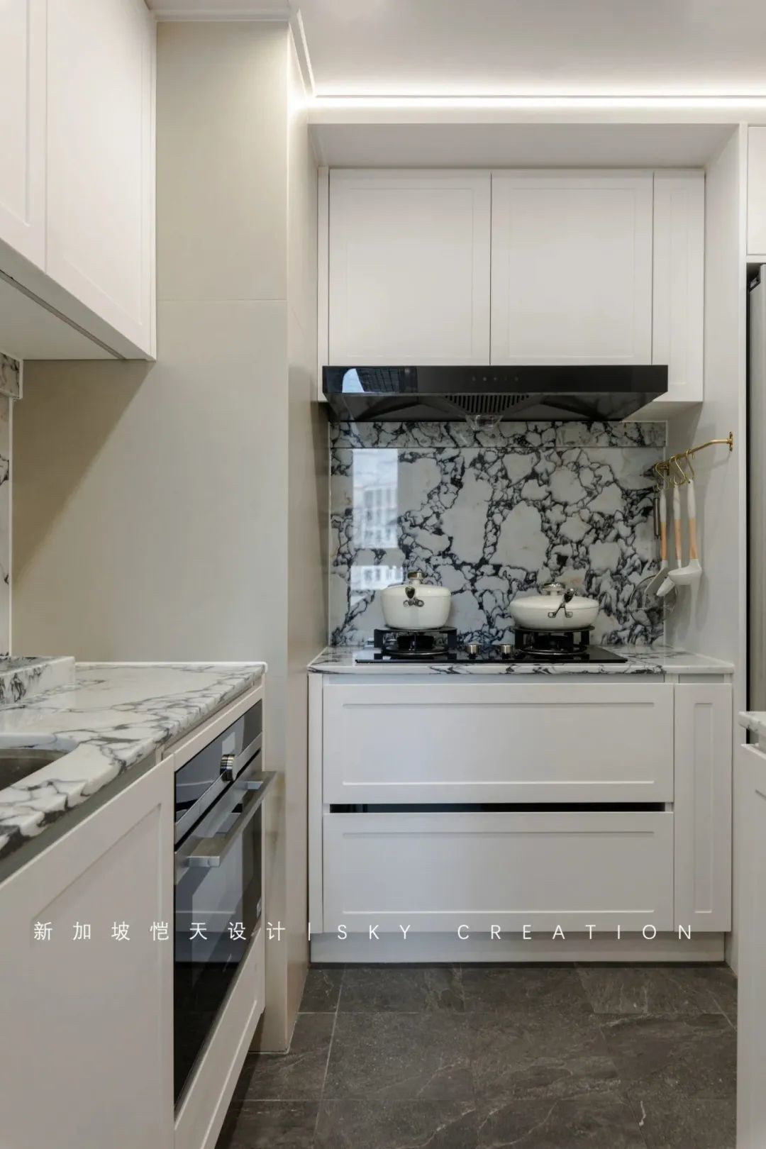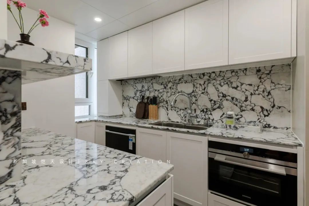 台面及背板特意选了宝格丽大理石,其花纹有一种自带高级的浪漫感,点缀空间、精致加分,也很好地呼应了客餐厅的法式元素。