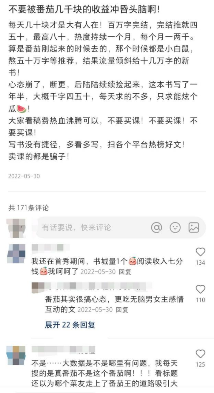 付费网站,作者按照千字结算稿费,但在番茄,作者的收益并不是按照广告点击次数来算,而是和字数、完读率、阅读时长、读者人数都有关系,具体价格如何计算,作者很难说出个所以然。一些番茄作者怀疑抱怨平台压价,却也只能根据感觉、经验模糊对比,拿不出实质证据,没地方讲理。