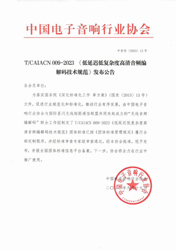 9 月 19 日,中国电子音响行业协会发布了《低延迟低复杂度高清音频编解码技术规范》发布公告,宣布其与国际星闪无线短距通信联盟共同发起成立的“无线音频编解码”联合工作组制定 T/CAIACN 009-2023 《低延迟低复杂度高清音频编解码技术规范》团体标准已按《团体标准管理规定》履行全部定制程序,并经标准审查专家组审查通过。