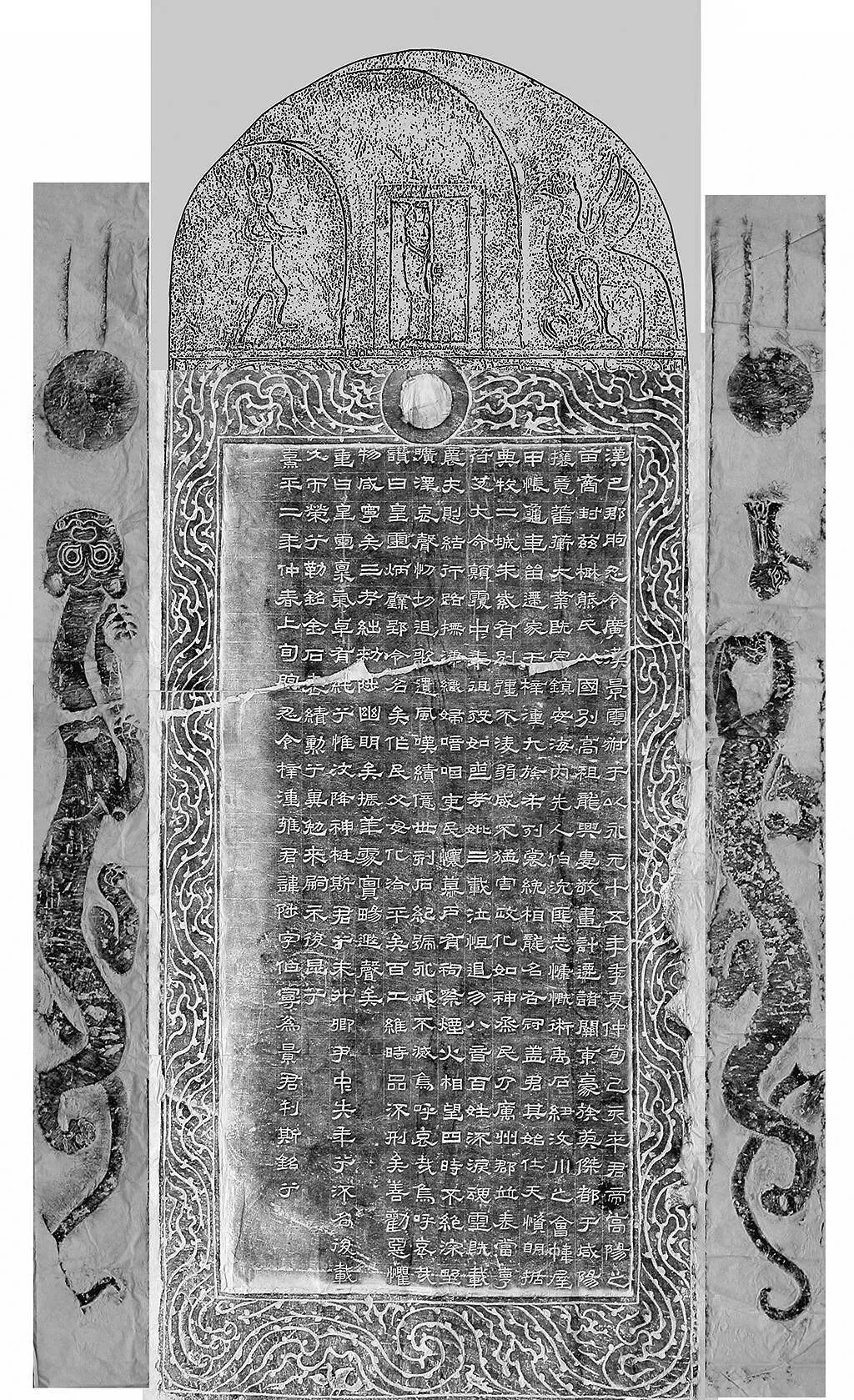 《景云碑》的制作极致精美,碑侧饰青龙、白虎的浮雕。碑额晕线旁亦有3幅浮雕,左侧为一朱雀,右侧为一兔首人身形象,这“金乌”、“玉兔”象征着日、夜;正中为一妇人立于半开门后,意思是“盼归”。碑文四周环以阴刻的流云、飞鸟。从“熹平二年仲春上旬朐忍令梓潼雍君讳陟宇伯宁为景君刊斯铭兮”末款可知,此碑立于东汉(公元173年),距今有1800多年。