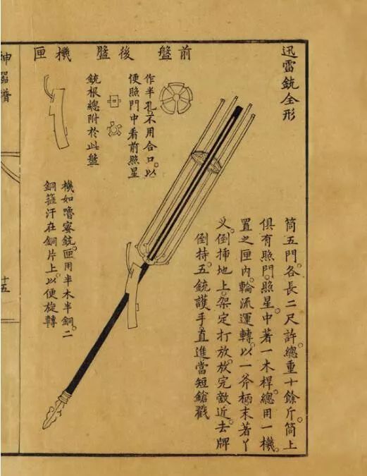 发射时,配属的小斧倒插地上,用来架枪。铳管和机匣对齐,按动扳机,依次发射。发射结束,若敌人迫近,可以去掉护盾,倒提铳身,用枪头刺杀对方。由于射程远、精度高,是压制骑兵突击的神兵利器。赵士桢随后改进了迅雷铳,能够连续发射18弹。著名的捷克造轻机枪,弹匣容量也不过20发。