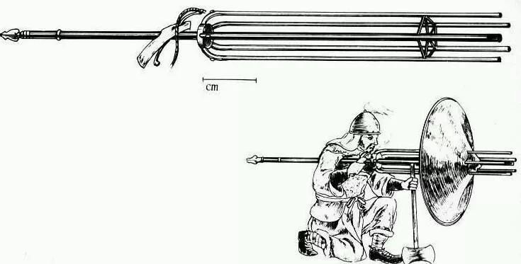 图3 迅雷铳,最大的迅雷铳可以达到18管,使用火绳或者燧石击发,加上外罩后状如琵琶,发射完毕后可以作为冷兵器使用。