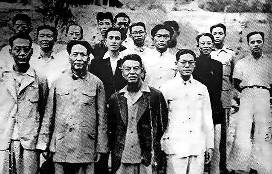 图:1944年6月3日,毛泽东(前排左二)在陕北延安接见了“中外记者参观团”,毛泽东旁边为《大公报》记者孔昭恺(前排左一)。