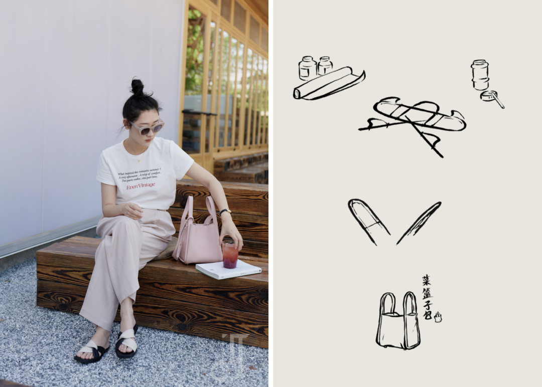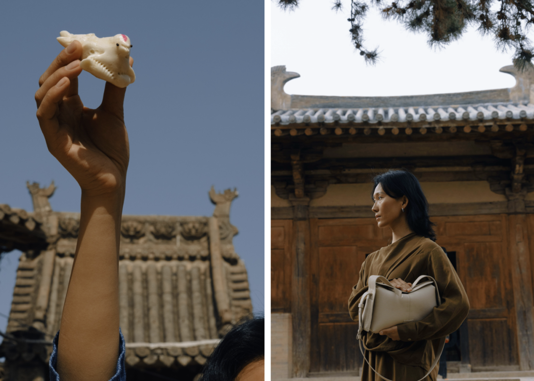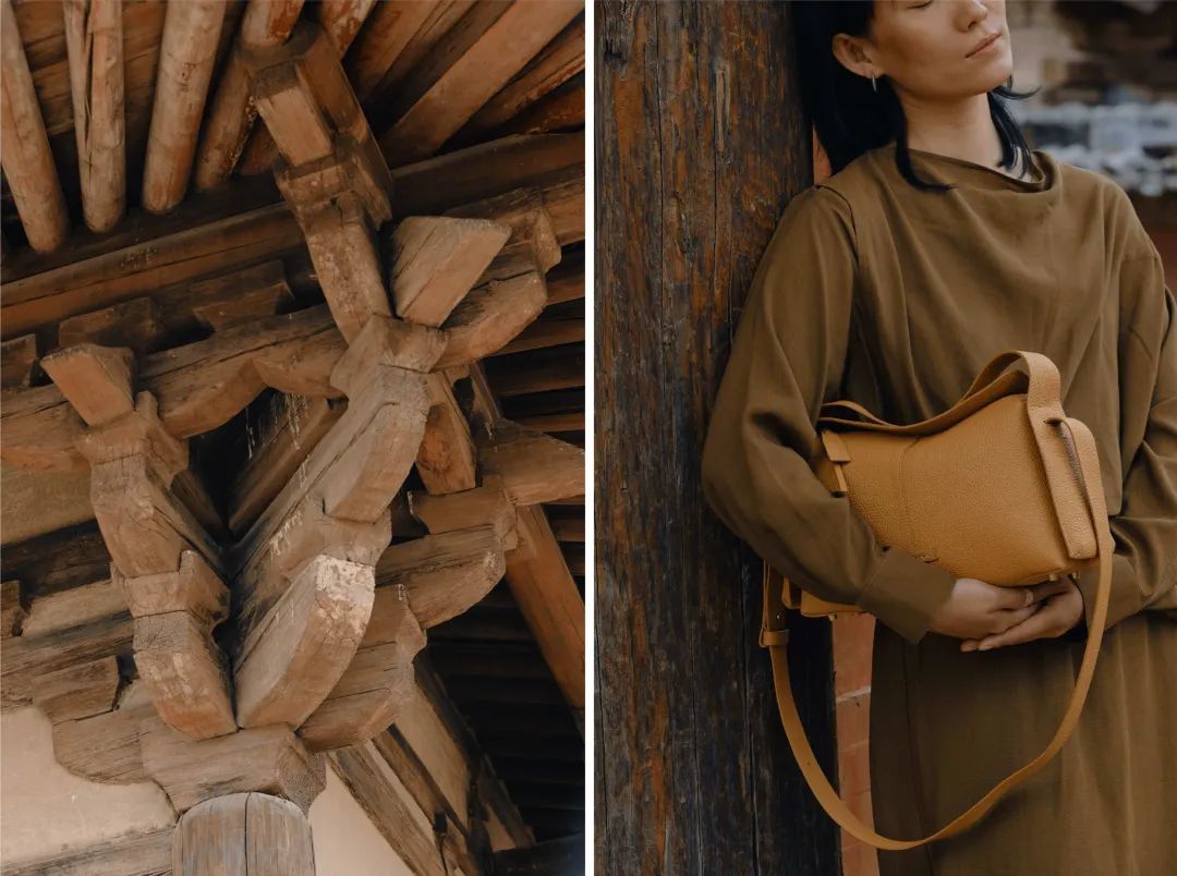 她回到故乡山西,走遍了土地和黄河,久久凝视着古建的飞檐翘角,以此作为创作灵感,设计了一系列包包,充满古拙之美,处处透露出东方自然自知的哲学。