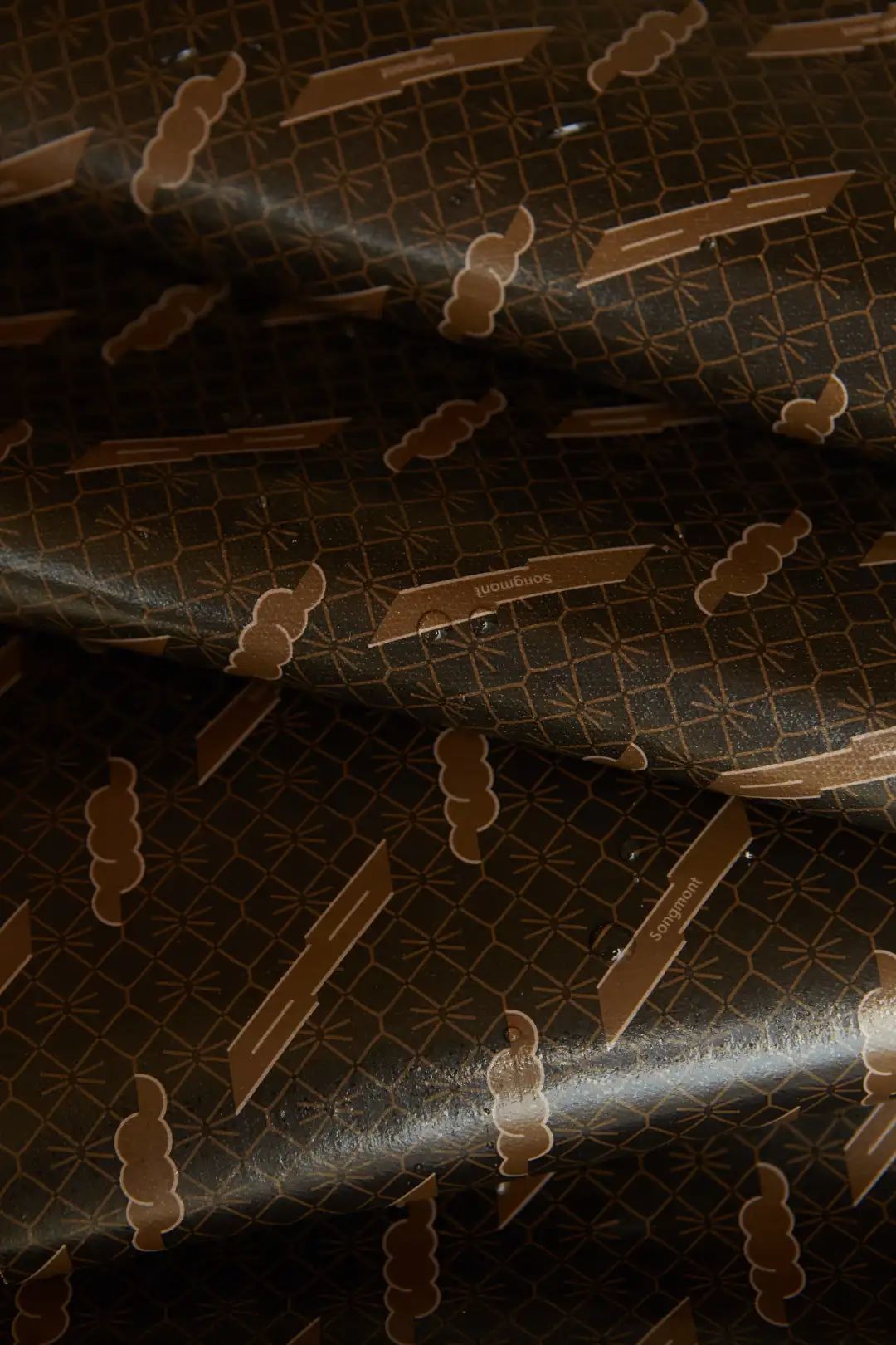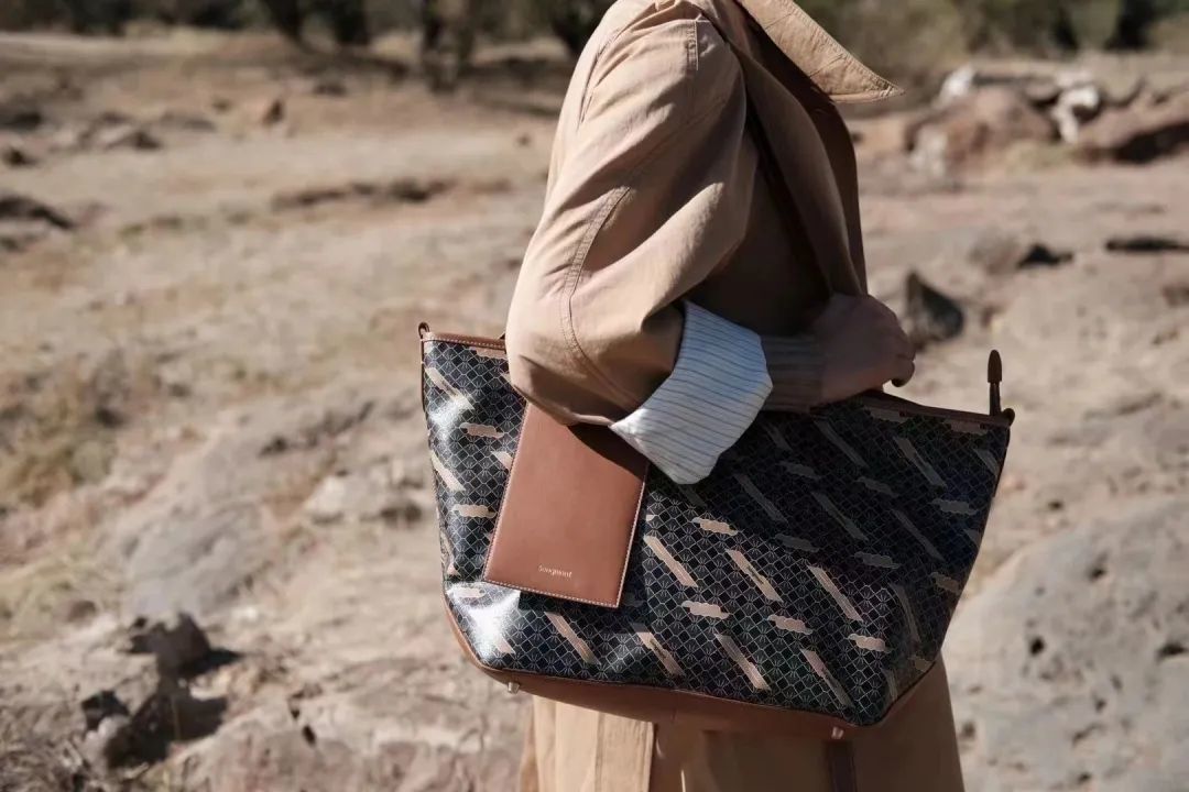 设计师直接以自然界的山、松、云、雨为灵感,创造了 Songmont 老花的中式写意图案。
