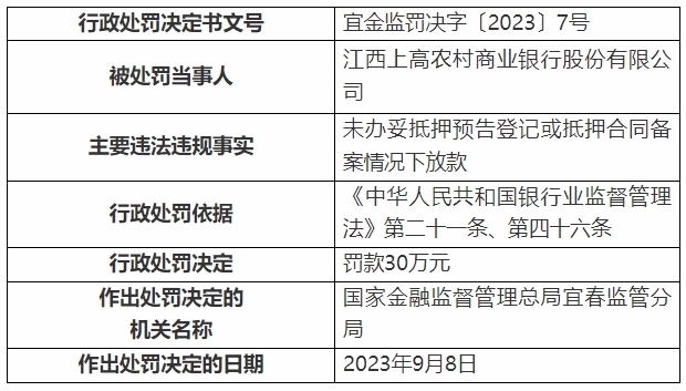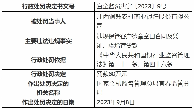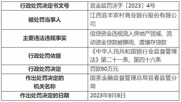信息显示,江西宜丰农村商业银行股份有限公司存在“信贷资金违规流入房地产领域、流动资金贷款被挪用、虚增存贷款”违法违规事实,江西上高农村商业银行股份有限公司存在“未办妥抵押预告登记或抵押合同备案情况下放款”违法违规事实,江西铜鼓农村商业银行股份有限公司存在“违规保管客户签章空白合同及凭证、虚增存贷款”违法违规事实。