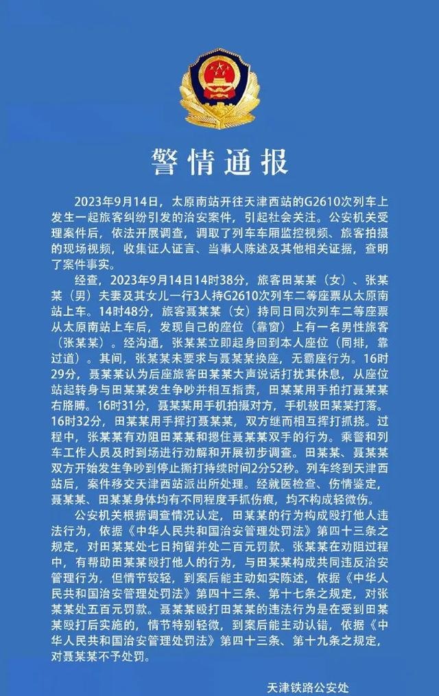9月20日,沸沸扬扬的“女子高铁被占座换回后遭殴打”事件,迎来了最新通报。对比此前的热搜词条和网络信息,可以发现存在一些出入。比如,张某某未要求与聂某某换座,无霸座行为;冲突是发生在聂某某认为后座旅客田某某大声说话打扰其休息之后。
