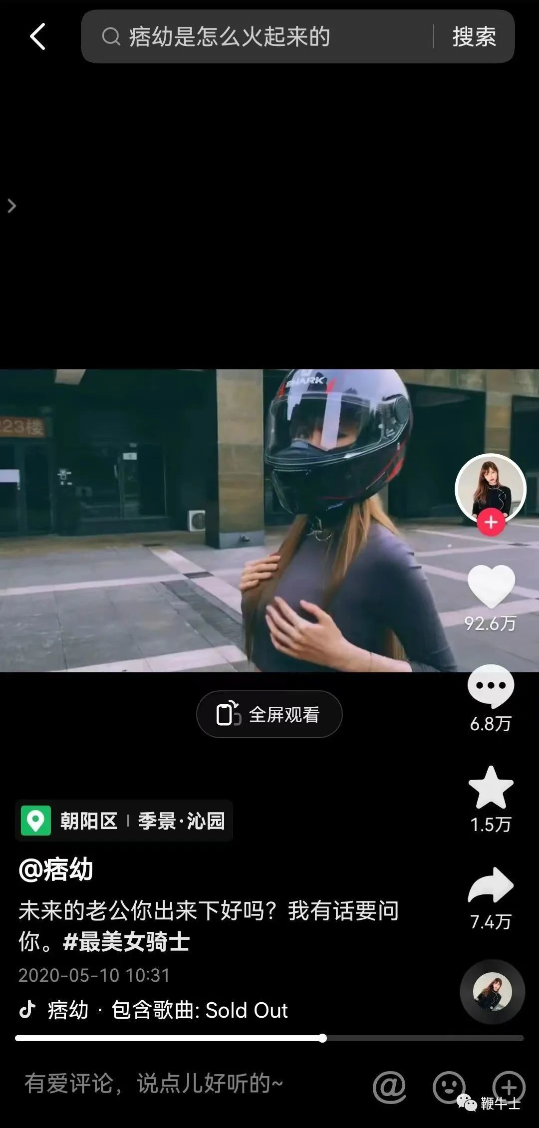 抖音上并不缺美女,但早期凭借机车+美女形成的巨大反差还是吸引了一大批男粉的眼球。比如痞幼在2020年5月更新的一则骑车的视频引发关注,该视频目前点赞量92.6w,有6.8w人评论,视频内容主要以凸显痞幼凹凸有致的身材为主。