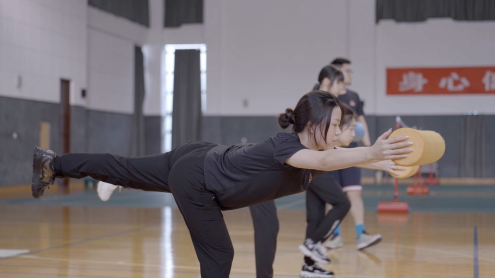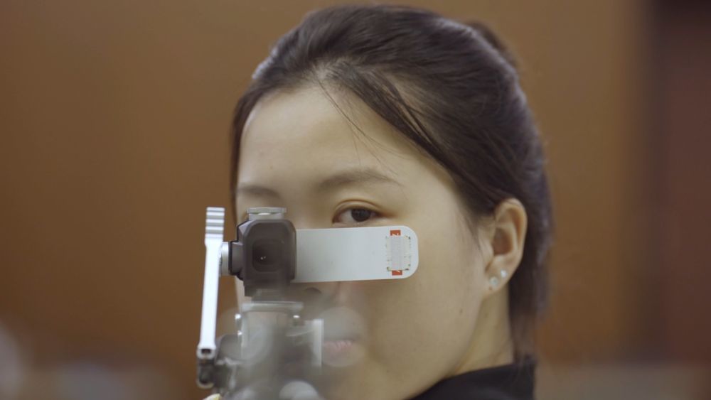 杨倩说,练习基本功的时候,主要以练持久性为主,用一根枪皮带把自己的左胳膊跟枪支连接起来。