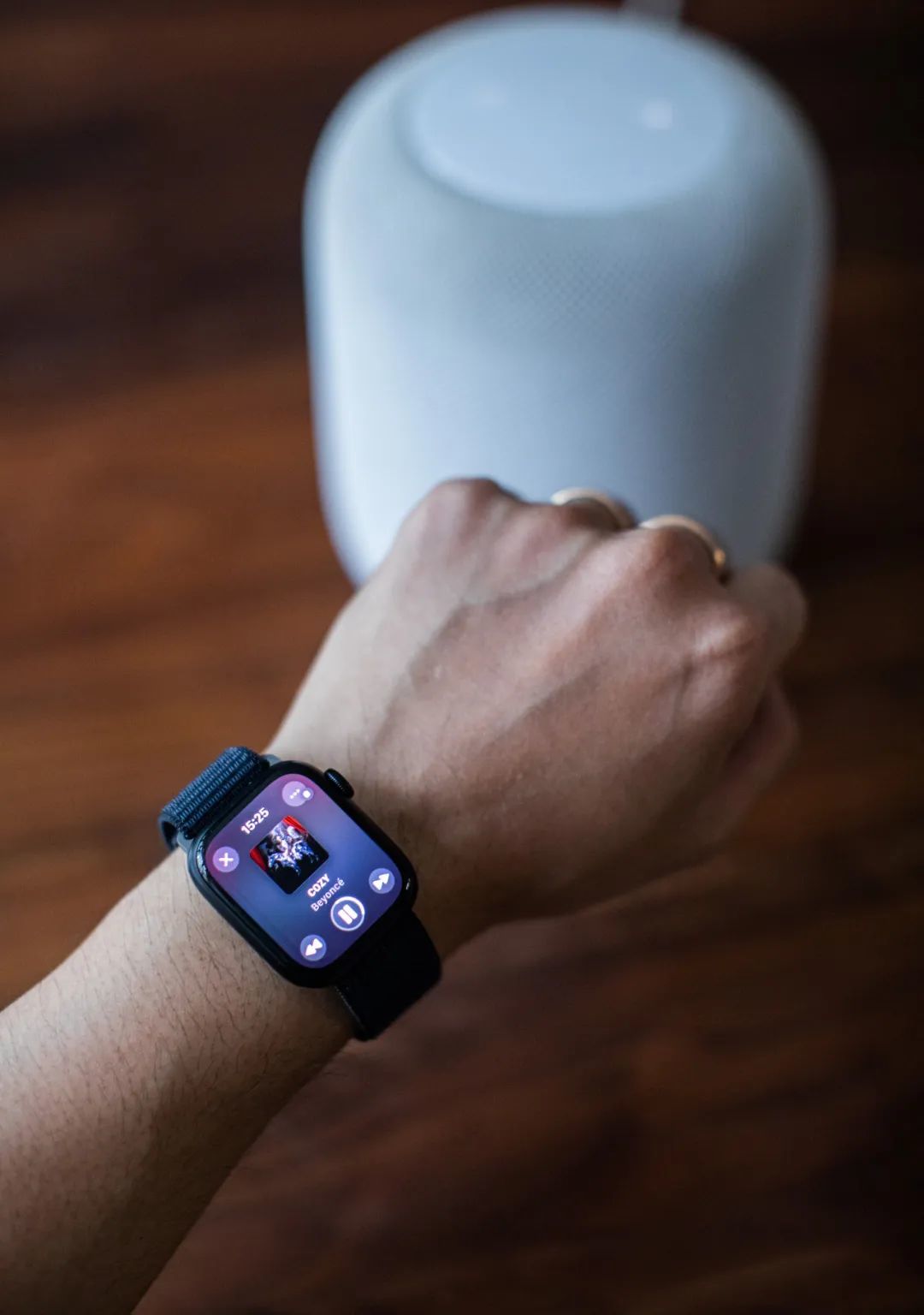 如果你家正好有 HomePod,那 Apple Watch Series 9 还可以与 HomePod 达成默契联手,组创一种新的联动方式,如果 HomePod 正在播音乐,Apple Watch Series 9 会打开「播放中」界面,便于用户随手操控;如果没有播放内容,智能叠放功能会主动推荐能够在 HomePod 上播放的内容。