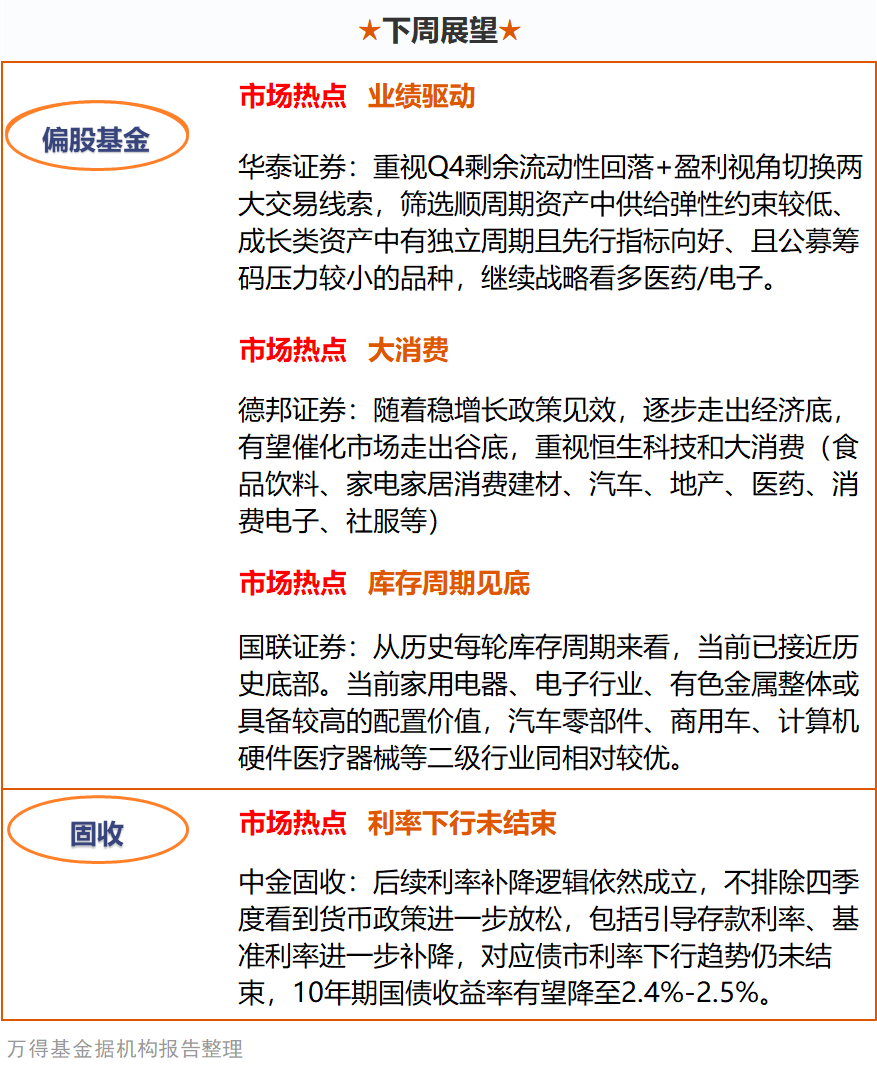 德邦证券认为,随着稳增长政策见效,逐步走出经济底,有望催化市场走出谷底,重视恒生科技和大消费,比如:食品饮料、家电家居消费建材、汽车、地产、医药、消费电子、社服等。