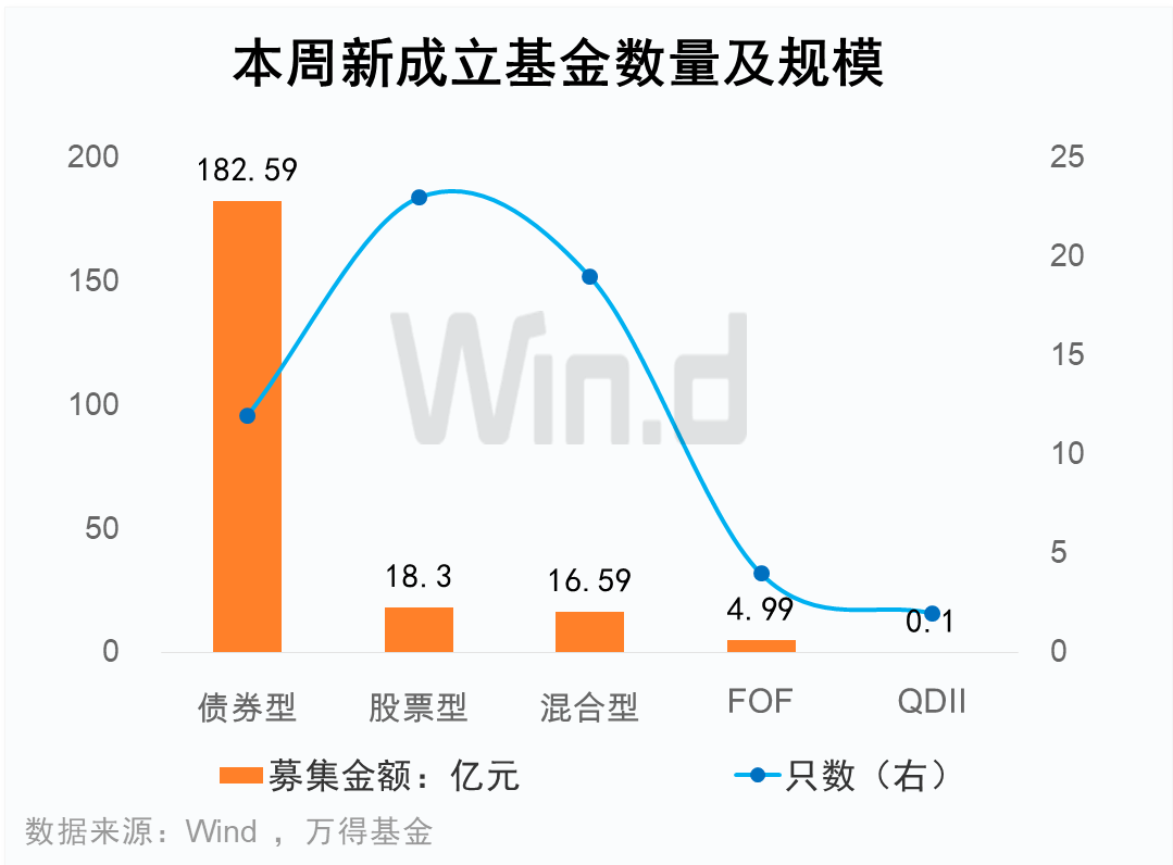 本周合计成立60只基金(ABC类分开统计),合计募集资金222.57亿元。其中,债券型12只,合计募集182.59亿元;股票型23只,合计募集18.3亿元;混合型19只,合计募集16.59亿元;FOF4只,合计募集4.99亿元;QDII2只,合计募集0.1亿元。