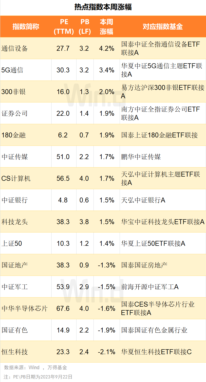 本周热门指数多数攀升,华为概念推升通信设备上涨4.2%,表现亮眼。