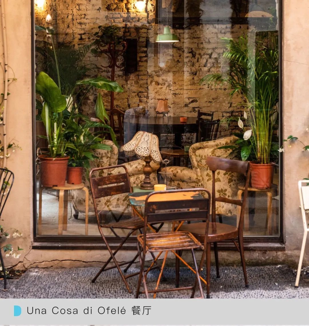 Una Cosa di Ofelé 是 Ofelé Milano 的第二家分店,位于古老的 19 世纪修道院 Via Scaldasole 中。对于餐厅名称的解释,ofelé 是“工匠或糕点师”,而 una cosa 的意思是“一件事”。小酒馆从早餐至晚餐营业,包括开胃酒和早午餐,菜单以素食为主,但也可以根据顾客的需求来提供定制餐服务。