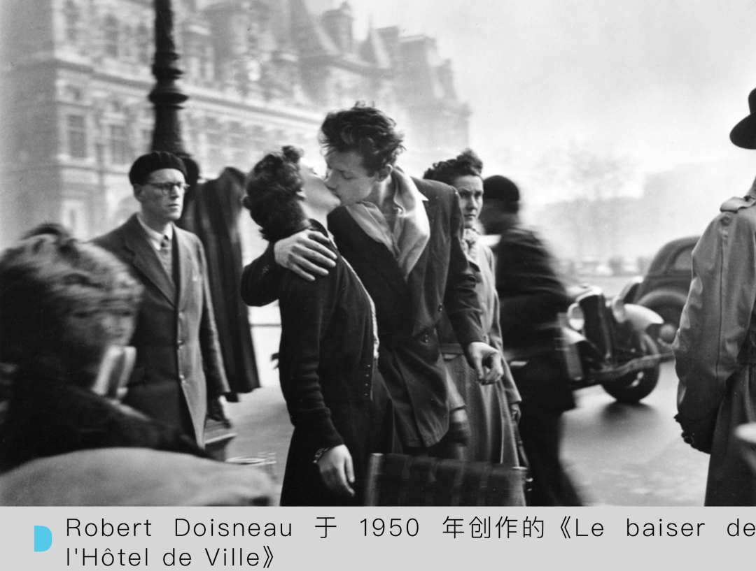 该展览由 Gabriel Bauret 策划,展现了 Robert Doisneau 50 多年的拍摄旅程中他最热爱的主题 — — 爱情、音乐、时尚。比如他的杰作之一《Le baiser de l'Hôtel de Ville》就描绘了 1950 年一对年轻夫妇在行人匆匆的巴黎市政厅前浪漫接吻的场景。这张照片被业界认为是彰显摄影定格瞬间能力的一个体现,但它实际上并不是摄影师即兴创作的,而是 Gabriel Bauret 为《Life》杂志拍摄的一张照片。