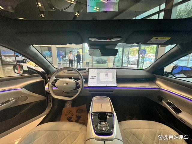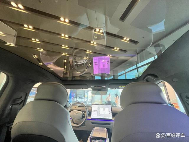 主驾驶位前方取消液晶仪表,取而代之是50英寸AR-HUD显示屏。据销售介绍AR-HUD头显可实时投放中控屏显示画面,用它来看电影非常的棒。同时这一设计也让驾驶者能够更加专注于行驶,而无需分心操作各种控制。
