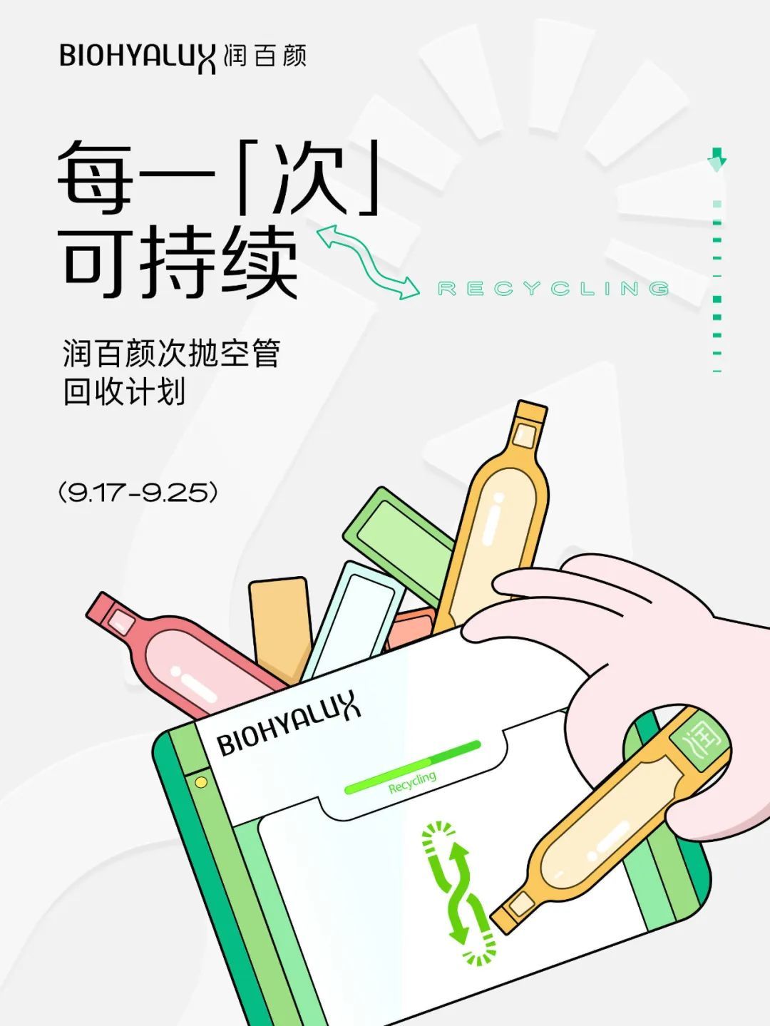 在世界清洁地球日当天(9月17日),润百颜再次启动“次抛空管回收”计划,消费者可通过官方微信小程序对已经空管的次抛精华包装进行回收,鼓励和带动消费者一起践行可持续生活。