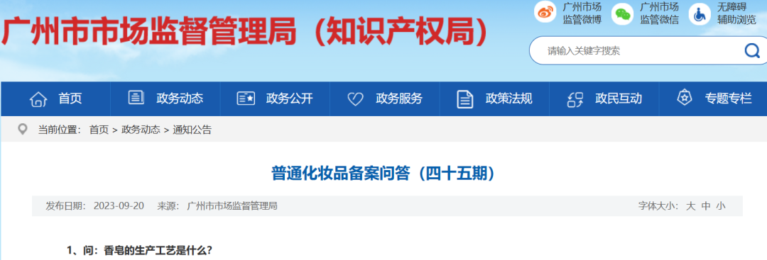 9月20日,广州市市场监督管理局发布了《普通化妆品备案问答(四十五期)》的通告。本次主要回答了香皂备案方面的问题: