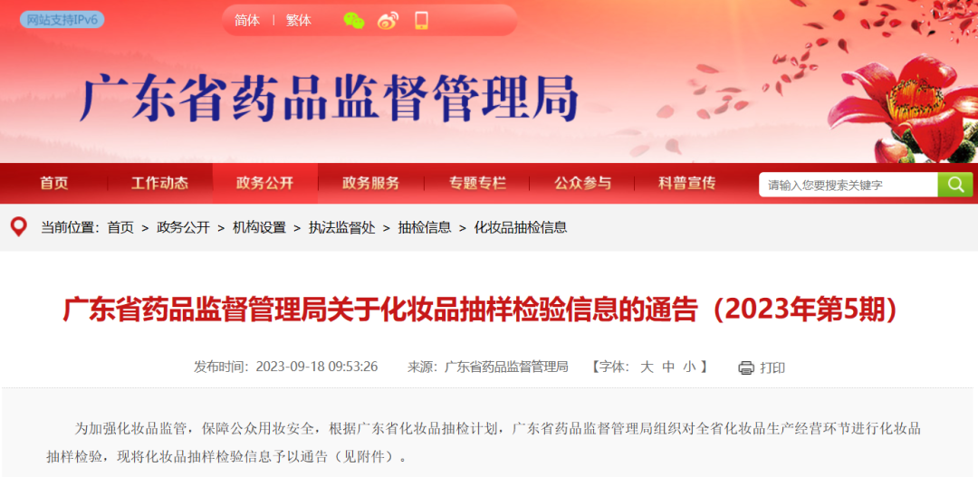 9月18日,广东省药品监督管理局发布了《广东省药品监督管理局关于化妆品抽样检验信息的通告(2023年第5期)》。