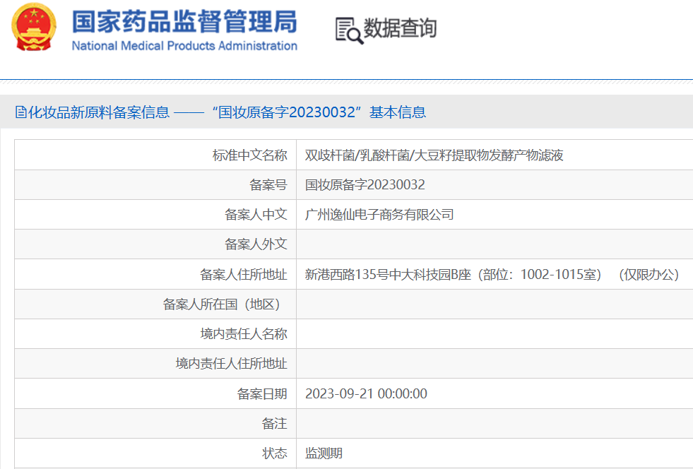 9月21日,国家药品监督管理局显示,广州逸仙电子商务有限公司的双歧杆菌/乳酸杆菌/大豆籽提取物发酵产物滤液原料完成备案,其为国妆原备字20230032,目前进入监测期。