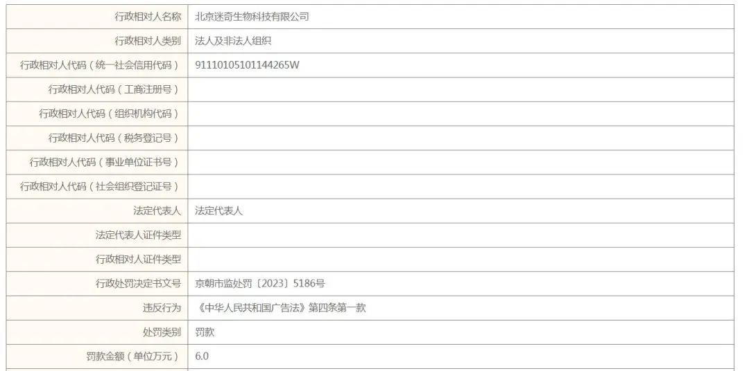 近日,天眼查显示,北京迷奇生物科技有限公司因虚假宣传被北京市朝阳区市场监督管理局罚款6万元。