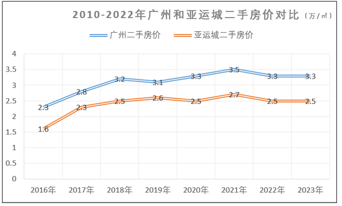 整体上亚运城的二手均价是低于广州的二手均价的,并且涨幅也稍缓慢一点。
