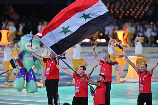 亚运会开幕式上的巴沙尔,也有幸给叙利亚队员同场致意。