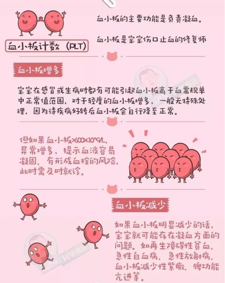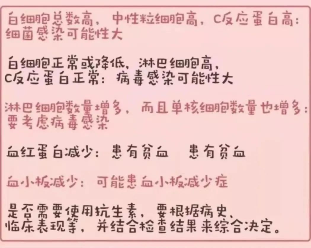 前面已经说过,白细胞是我们的警察,警察分很多种,白细胞也不例外。白细胞分为中性粒细胞、淋巴细胞、单核细胞、嗜酸性粒细胞和嗜碱性粒细胞五种,具体作用也各不相同。比如中性粒细胞升高,提示细菌感染的可能性较大;淋巴细胞升高,表明病毒感染的可能性更大。红细胞和血红蛋白代表的意义是一样的;如果两者都降低,提示贫血。血小板升高,提示原发性血小板增多症;血小板降低,提示原发性血小板减少症。