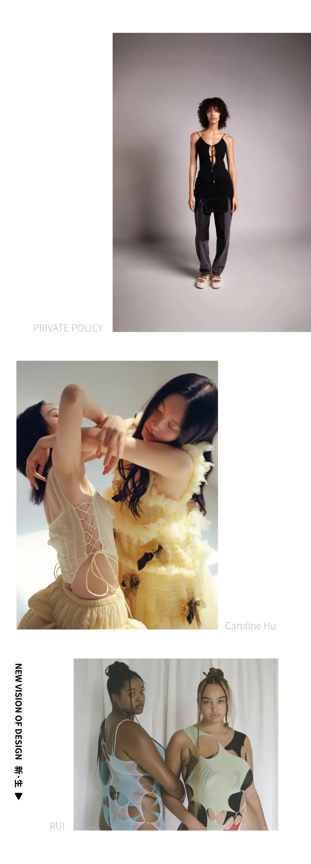 近年来,大批中国设计师也在世界时装周舞台上大放异彩,成为时尚界的年轻力量,推动了从“Made in China”到 “Designed in China”的认知转变。Private Policy 以环保理念和青年精神为创作母题;Caroline Hu以油画笔触般的手工褶皱工艺描绘浪漫敏感的不确定性;RUI 成为第一个获得 LVMH Karl Lagerfeld Prize 的中国设计师、以针织为媒介,书写自我认同。