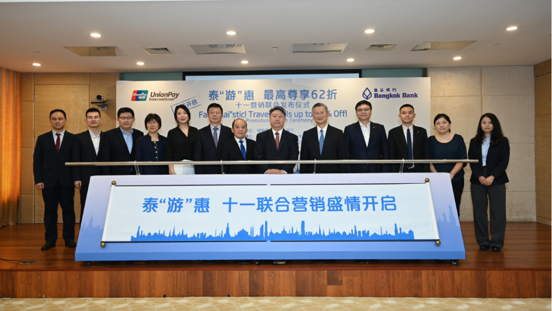 9月25日,银联国际联合泰国盘谷银行、携程和境内商业银行共同宣布,推出泰“游”惠主题优惠活动。中国银联总裁兼银联国际董事长蔡剑波、盘谷银行行长陈智深、泰国国家旅游局上海办事处代表罗泰东、携程集团副总裁王慧,中国工商银行、中国农业银行、中国银行、中国建设银行、交通银行、招商银行、兴业银行、浦发银行、上海银行代表出席发布仪式。