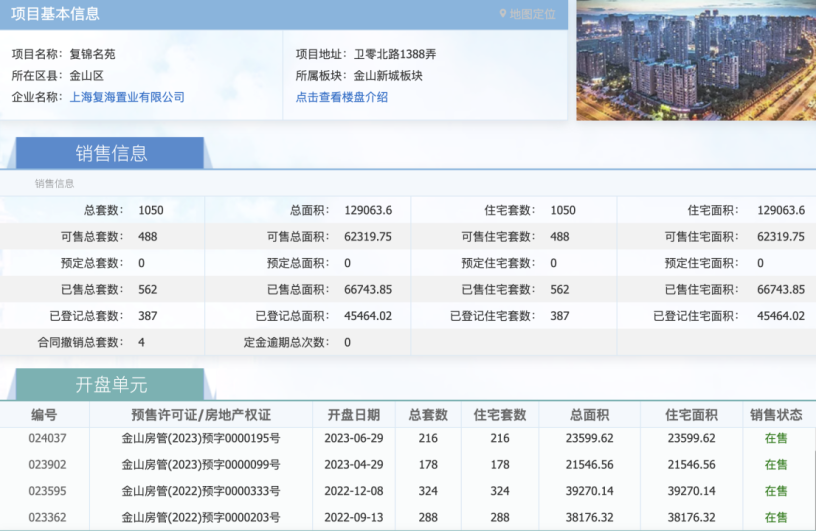 复地星愉湾开发商为复地集团,项目于2022年9月13日首开,截止到目前,项目共推出1050套房源,可售住宅套数还有488套。
