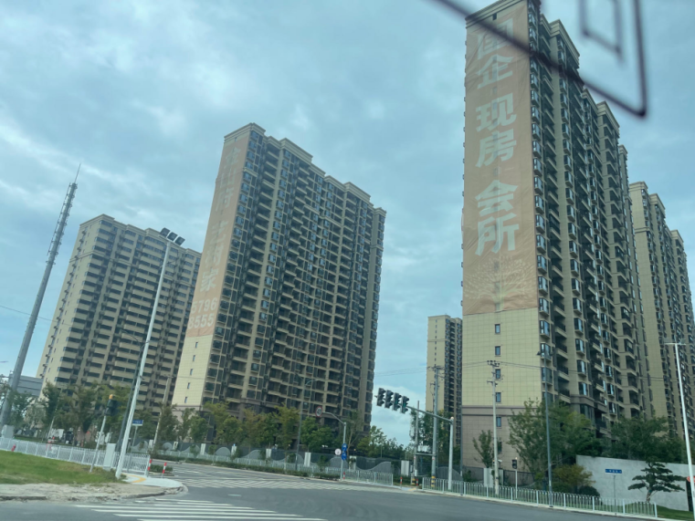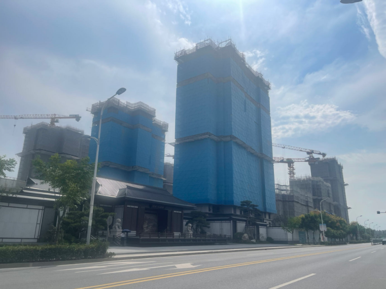 在项目附近,远远能看到小区楼盘已建好,已有业主出入,而在已建好的楼栋上还悬挂着巨幅标语:国企、现房、会所。