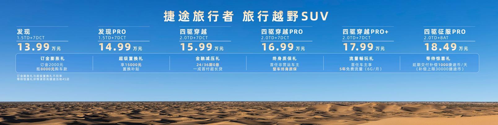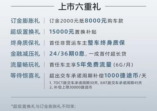 新车上市期间,捷途旅行者还为用户带来多重豪礼。即日起,订购捷途旅行者的用户,即可享受“订金膨胀礼”、“超级置换礼”、“终身质保礼”、“金融减压礼”、“流量畅玩礼”、“等待惊喜礼”六大权益。从订车到金融方案购车再到等车、用车,捷途旅行者都懂用户所想、宠用户所需,助力所有“旅行向往者”出发。