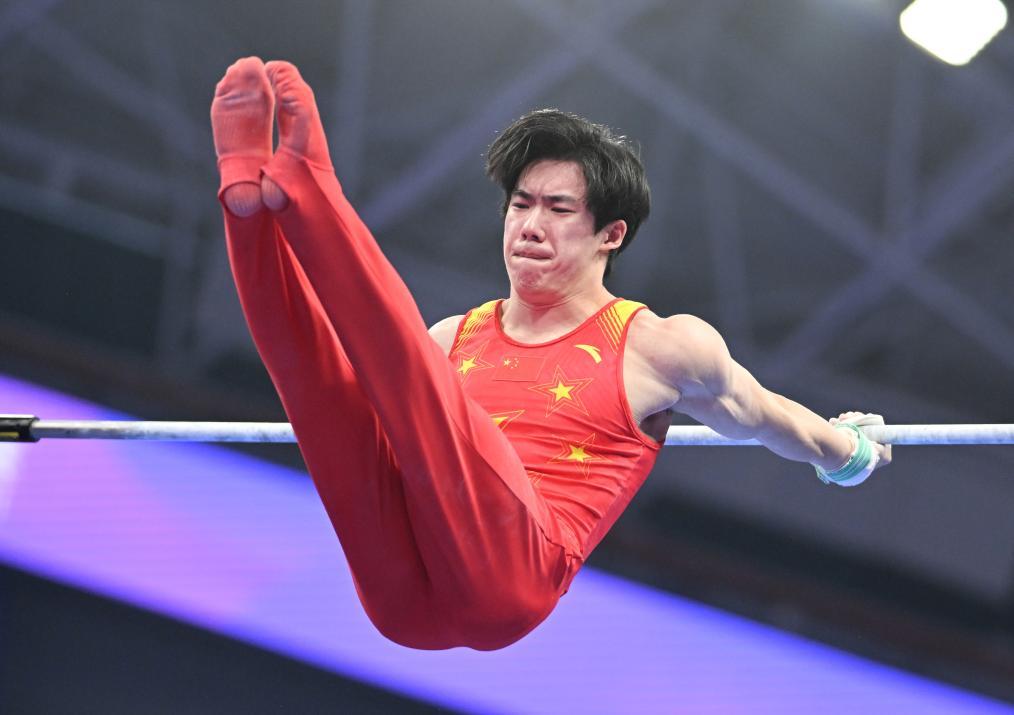 9月26日,张博恒在单杠项目比赛中。新华社记者 程敏 摄