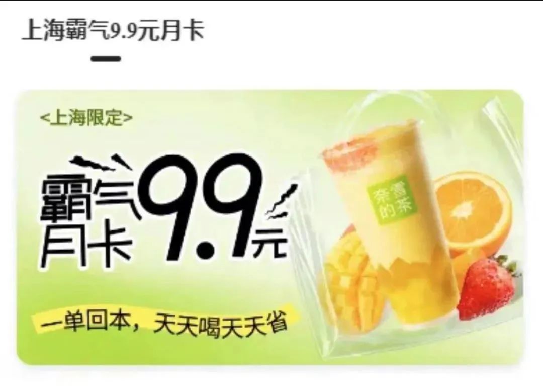 在蜜雪冰城、瑞幸等品牌的影响下,降价成为新茶饮吸引消费者的重要手段。除了此前喜茶、奈雪的茶(以下简称“奈雪”)集体降价外,7月,奈雪还推出了一款名为“上海霸气9.9元月卡”的活动。
