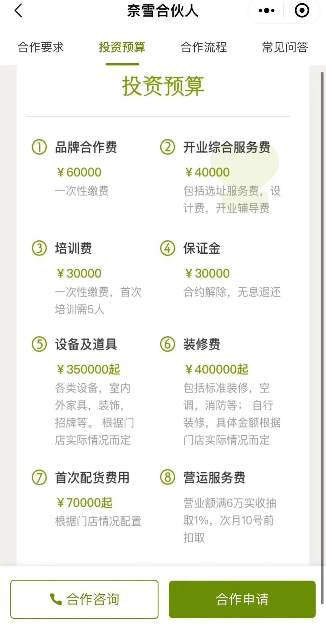 对比其他品牌的加盟条件,喜茶、奈雪的门槛较高。特别是奈雪,其单店加盟成本就要100万元左右,这其中还不包括房租、人工及首批进货款。其中设备费用需要35万元,店面要求90-170平方米,装修费用40万元起。喜茶与乐乐茶费用在40万-80万元,霸王茶姬、茶百道、古茗、蜜雪冰城则在30万-60万元。