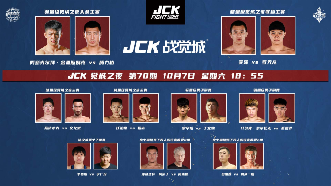 北京时间10月7日,JCK觉城之夜N70将进行一场重磅对阵,打响战觉城首场金腰带挑战权争夺战。2021赛季的“赏金之王”阿斯克尔拜时隔一年时间重返战觉城的八角笼,迎战自己的老对手腾力格,两人间胜利的一方将拿到挑战现任金腰带拥有者王纪征的机会。