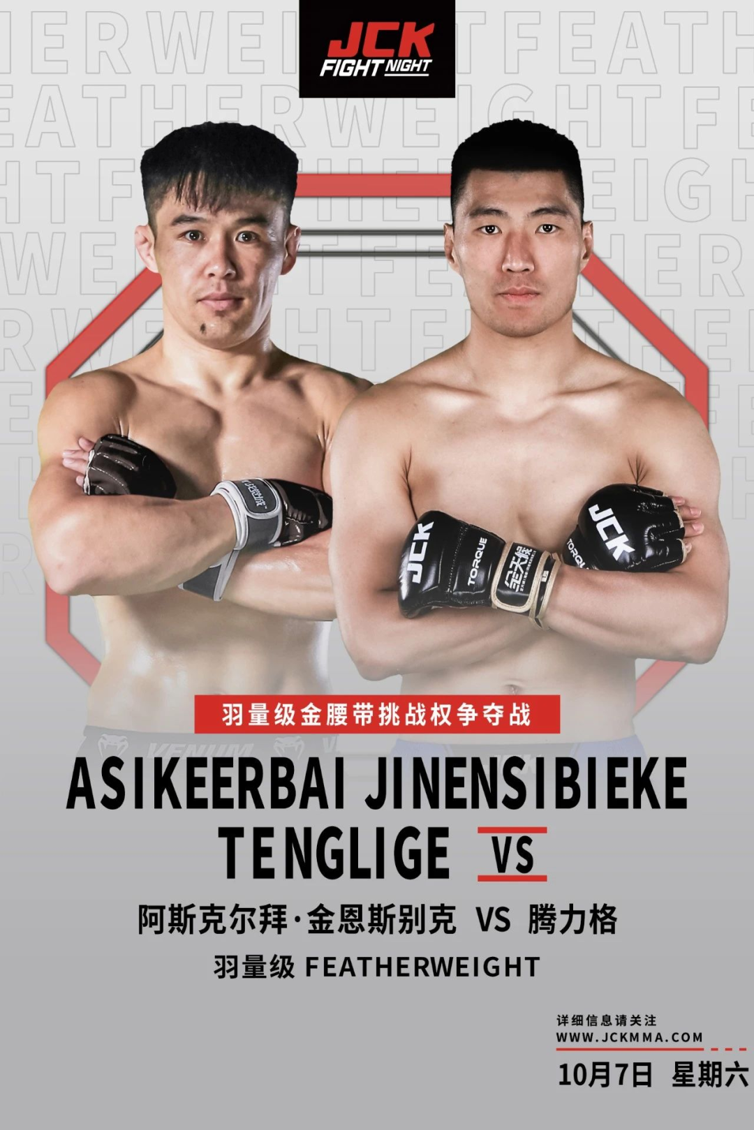 两位老对手再次在八角笼中相遇,究竟是擅长地面的阿斯克尔拜会拿下胜利?还是说更年轻、持续进化中的腾力格更胜一筹?地面VS站立,你支持谁?北京时间10月7日,JCK战觉城N70揭晓答案。