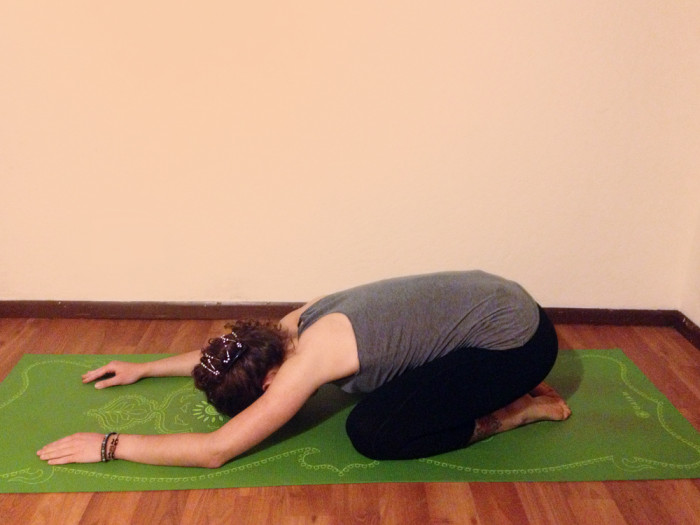 跪坐,调整身体,直到可以舒适地坐在脚后跟之间,膝盖放在地板上。躺下时,将重心转移到双手上,然后转移到放在地上的前臂上。用指尖和手掌支撑下背部,然后慢慢的释放到地面或身后的支撑物上。保持膝盖与臀部成一直线。拉长下背部,将尾骨向前拉,双手放在身体两侧,就像摊尸式一样,掌心向上,手指放松。
