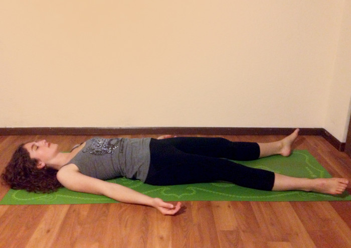 仰卧,双臂伸出,手掌朝上。充分而缓慢地吸气和呼气。也可以在膝盖下方放一条卷起的毯子。专注于你的呼吸,可以微微闭眼,用手轻轻按摩腹部,可以保持较长时间。