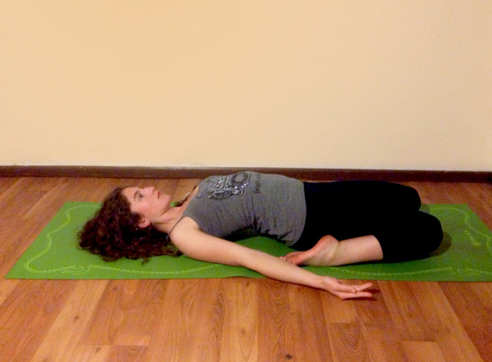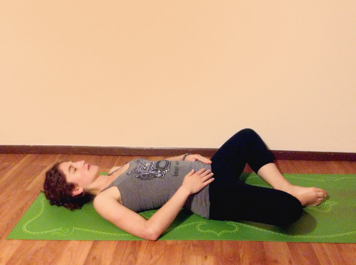 仰卧,双脚并拢,膝盖朝外,而不是向上,膝盖向上会形成倒立体式,倒立会阻止身体毒素的释放。将手臂向外张开或将手放在腹部上,轻揉。缓慢而深地吸气和呼气,闭上眼睛。
