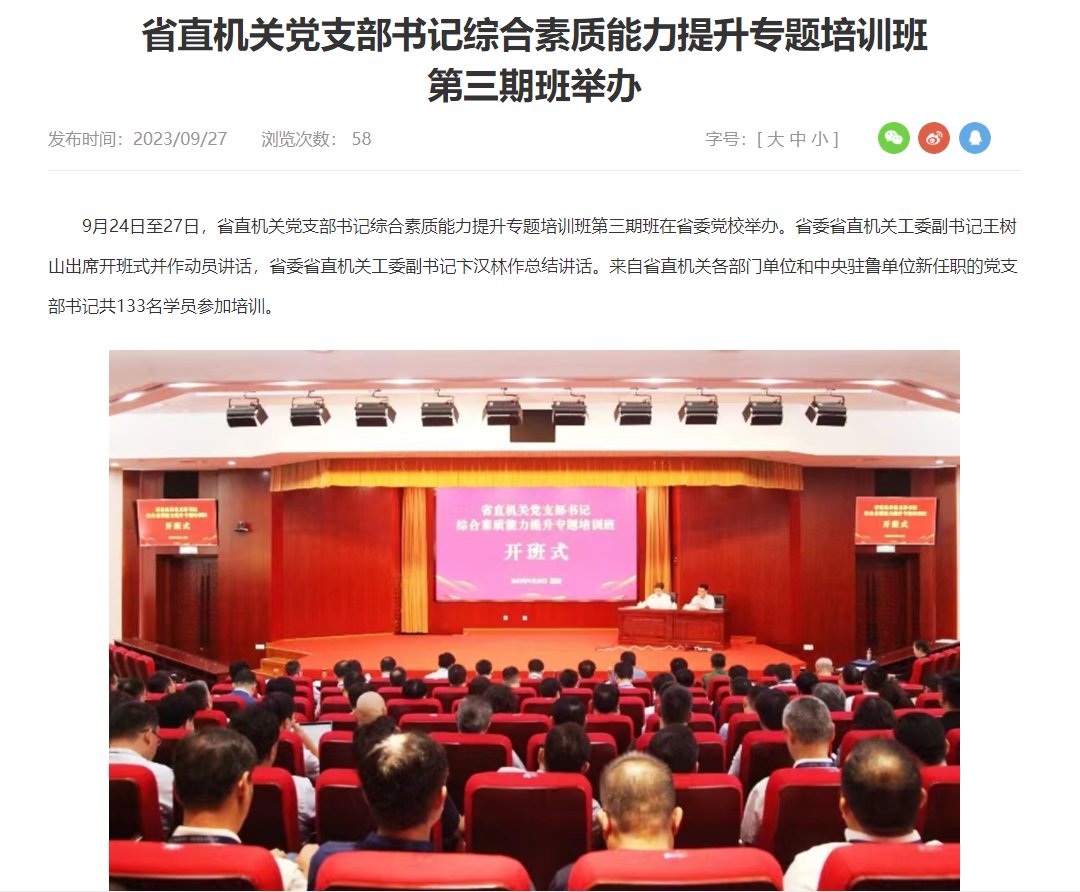据山东机关建设网站消息,9月24日至27日,省直机关党支部书记综合素质能力提升专题培训班第三期班在省委党校举办。省委省直机关工委副书记王树山出席开班式并作动员讲话,省委省直机关工委副书记卞汉林作总结讲话。