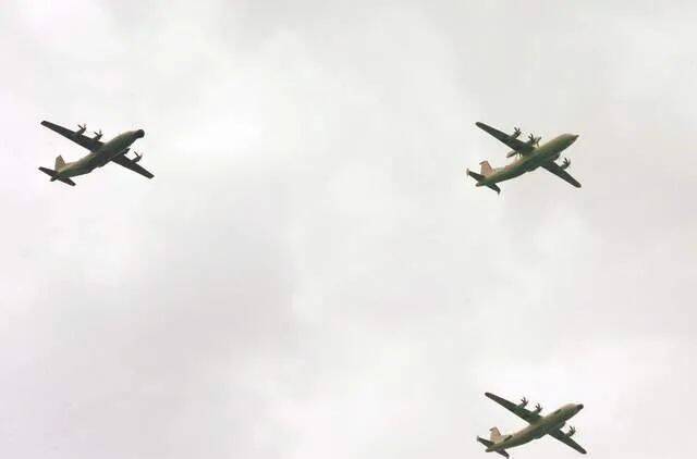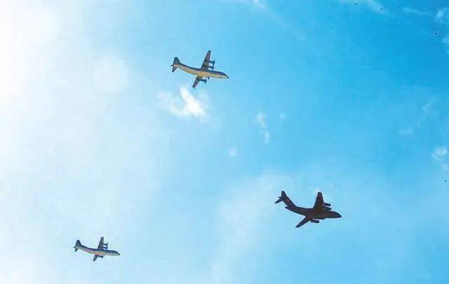 在建军90周年阅兵式中,组成三机编队的1架运-20和2架运-9运输机