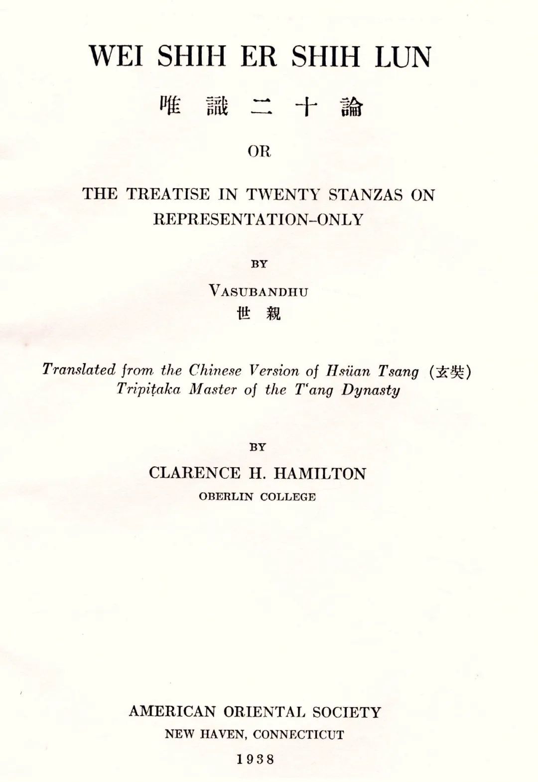 11. Wei Shih Er Shih Lun, The Treatise in Twenty Stanzas on Representation-only by Vasubandhu, translated from the Chinese Version of Hsuan Tsang(玄奘),Tripitaka Master of the Tang Dynasty, by Clarence H. Hamilton, American Oriental Series, Volume 13, American Oriental Society, New Haven, Connecticut, 1938.