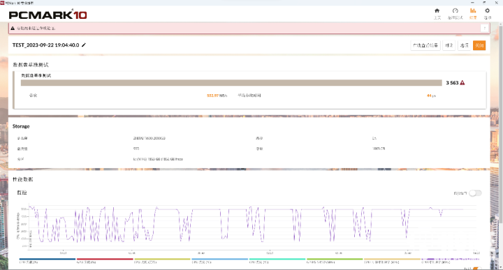 PCMark 10的存储基准测试使用一系列流行应用程序和常见任务的真实轨迹,以全面测试硬盘的性能。致态Ti600在数据盘基准测试中取得了3155分的成绩,平均带宽达到532.97 MB/s,平均存取时间仅为44微秒,性能表现十分稳定。用作游戏盘、视频编辑缓存盘等使用,完全能够满足要求。