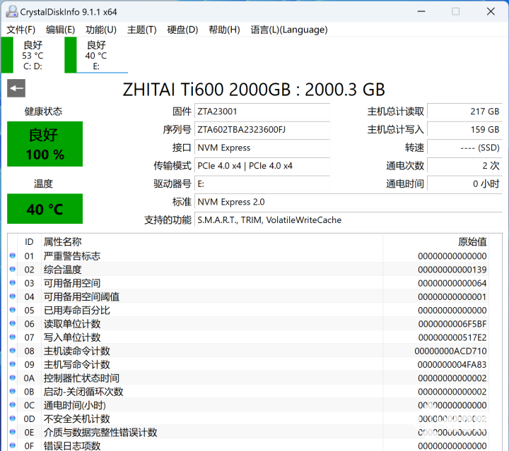 首先是CrystalDisk,在CrystalDiskInfo的信息里,我们可以看到致态Ti600的基础信息,包括固件版本、写入总量、通电次数、接口标准、传输模式、运行温度等信息。
